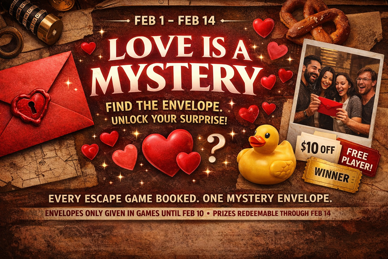 From February 1–10, every escape game booked at Legends of Xscape includes a hidden Mystery Envelope inside the room. Prizes must be redeemed by 2/14/26